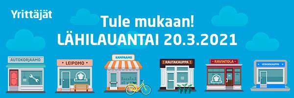 Koko Suomessa vietetään 20.3. ensimmäistä kertaa Lähilauantaita. Tuemme sillä paikallisia yrityksiä ja yrittäjiä. Nyt jos koskaan on tärkeää pitää yhtä, tukea lähipalveluita ja pitää alueen rattaat pyörimässä.