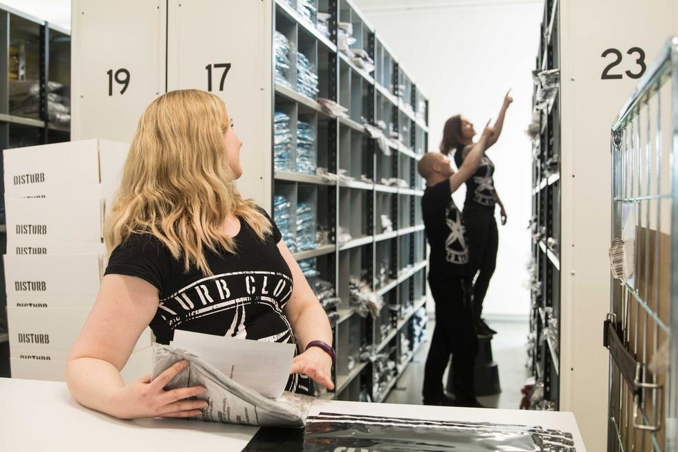 Disturbin pääpaino on verkkokaupassa, siksi suurin osa toimitiloista on varaston valtakuntaa, jossa tehokas varastotiimi Ulla Hanska, Rebecka Kostin ja Irene Aho pakkaa tilaukset matkaan usein jo tilauspäivänä. Kuva: Lapin Kansa.
