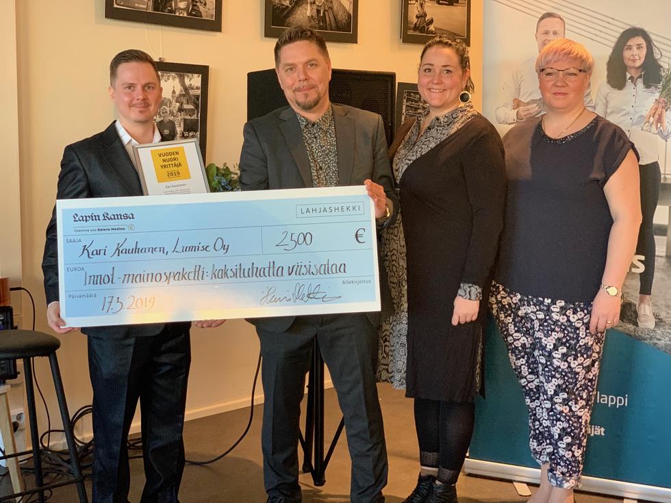 Kiireistä palkittua sijaisti Jarmo Kuukasjärvi, Lapin Kansan myyntiyksikön päällikkö Henri Mattinen luovutti voittajalle Innot mainospakettisekin, mukana onnittelemassa Tekijäklubin pj. Eliisa Lintula ja Lapin Yrittäjien pj. Anna-Kaisa Luoma-aho.