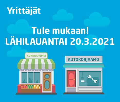 20.3.2021 järjestetään valtakunnallinen Lähilauantai: Suomen Yrittäjät kannustaa kampanjalla ihmisiä ajattelemaan omien ostostensa vaikutusta omaan lähiympäristöön.