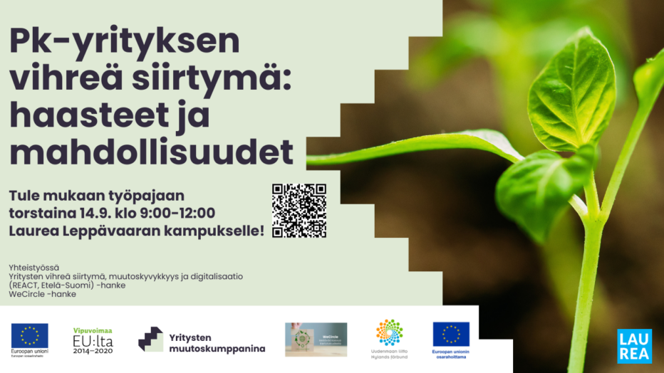 Pk-yrityksille suunnatut työpajat järjestetään osana Yritysten vihreä siirtymä, muutoskyvykkyys ja digitalisaatio (REACT, Etelä-Suomi) ja WeCircle-hankkeita.