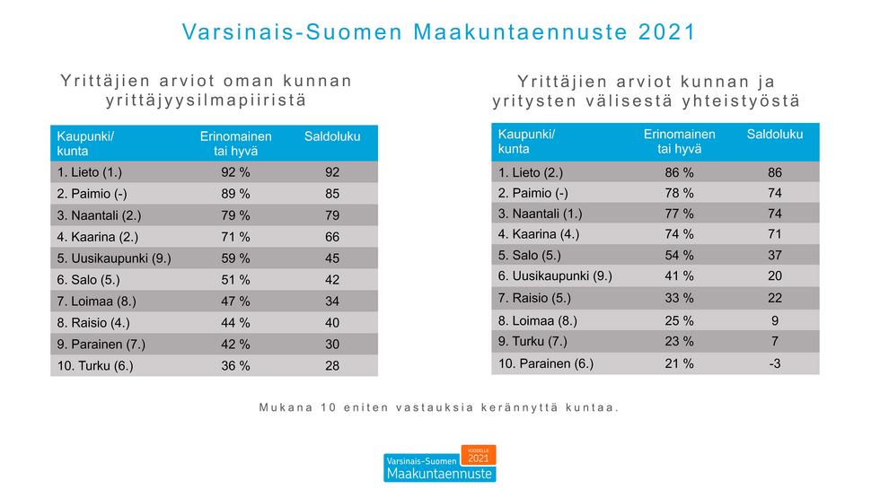 Yrittäjät saivat jälleen vuoden 2021 Maakuntaennusteessa arvoida oman kuntansa yrittäjäyysilmapiiriä sekä kunnan ja yritysten välistä yhteistyötä. Lieto otti kärkisijan molemmissa kategorioissa. Lietolaisista vastaajista 92 prosenttia arvioi kunnan yrittäjyysilmapiirin erinomaiseksi tai hyväksi.