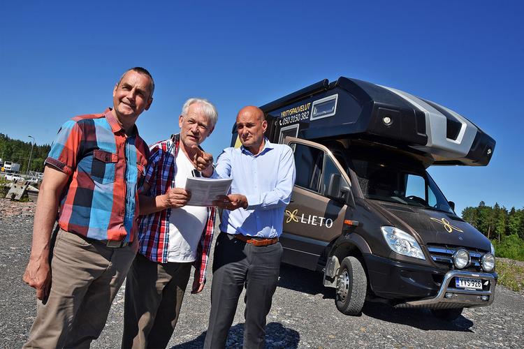 Pääkuvassa: Liedon Mobiilit elinkeinopalvelut -toimistoauto, jonka edessä Mika Stepanoff, Ari Blomroos ja Esko Poikela katsastavat Avantin yritysalueen työmaata. (Kuva: Liedon kunta)
