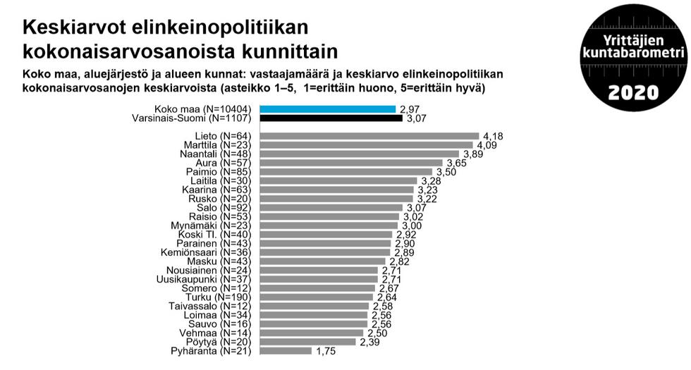 Liedon valtakunnallinen ykkössija keskisuurten kuntien kategoriassa selvisi jo tiistaina, kun Suomen Yrittäjät julkisti barometrin tuloksia. Lieto on Varsinais-Suomen yrittäjäystävällisin kunta (arvosana 4,18), kakkosena on Marttila, joka nousi myös pienten kuntien valtakunnallisessa listauksessa kakkossijalle. Marttila sai elinkeinopolitiikastaan vastaajilta kokonaisarvosanan 4,09. Kolmossijan otti Naantali, joka on myös valtakunnallisessa rankingissa keskisuurten kuntien pronssipallilla. Isojen kuntien sarjassa Salo nappasi valtakunnallisen kolmossijan ja on Varsinais-Suomen listalla sijalla 9.