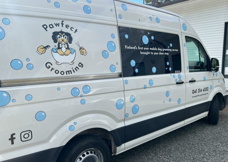 Yrittäjäpariskunta toi bisnesidean Englannista Suomeen. Asiakas voi tilata koiralleen trimmaajan mobiilisovelluksella, ja pian hoitovälineillä varusteltu pakettiauto on kotiovella.