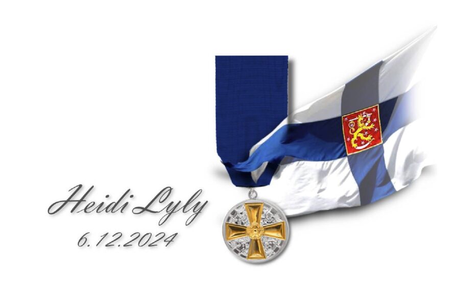 Tasavallan Presidentti Aleksander Stubb on myöntänyt päivämäärällä 6.12.2024 Suomen Valkoisen Ruusun ritarikunnan 1. luokan mitalin kultaristein toimitusjohtaja Heidi Lylylle.