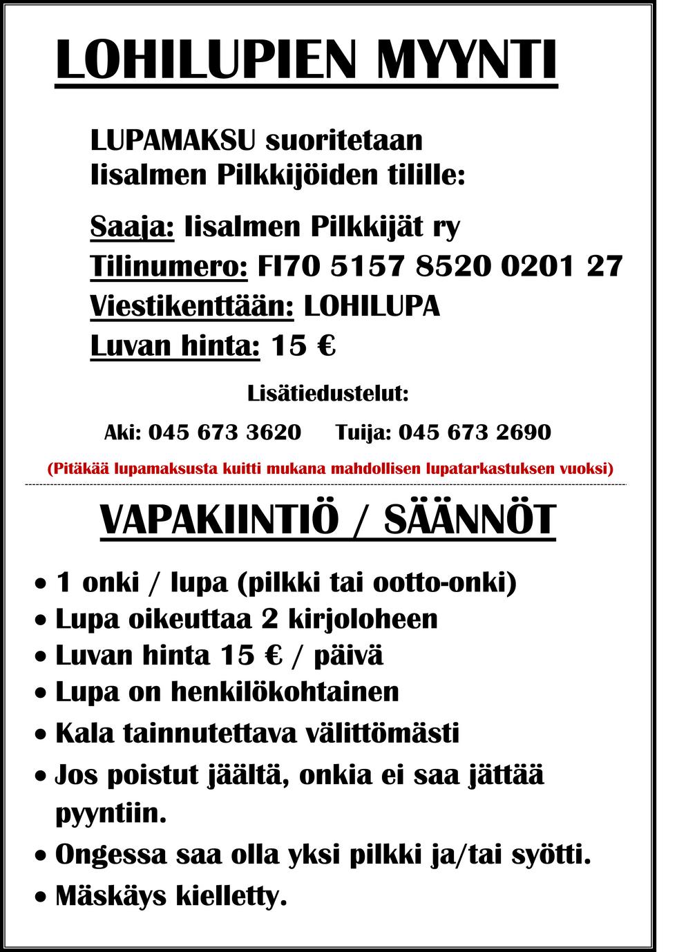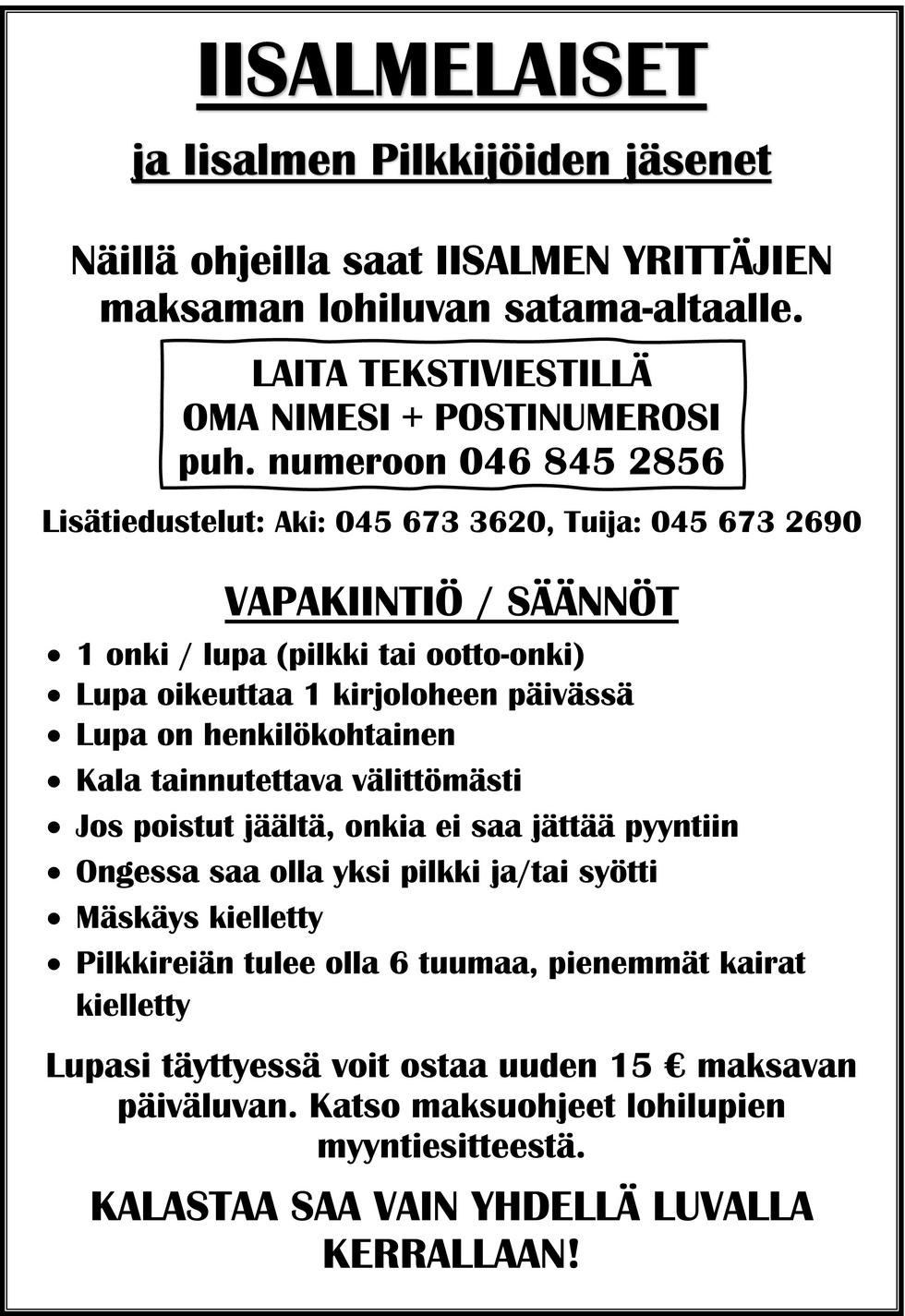 Iisalmen Yrittäjät yhdessä yhteistyöjäsentensä kanssa tarjoaa iisalmelaisille yksityishenkilöille ja perheille lohipilkintää Iisalmen satama-altaassa. Pilkinnän mahdollistaa Iisalmen Pilkkijät ry. Tämän yhteistyön ansioista kaupunkimme asukkaat pääsevät lohipilkille ja kaikki mukana olevat tahot saavat positiivista julkisuutta.