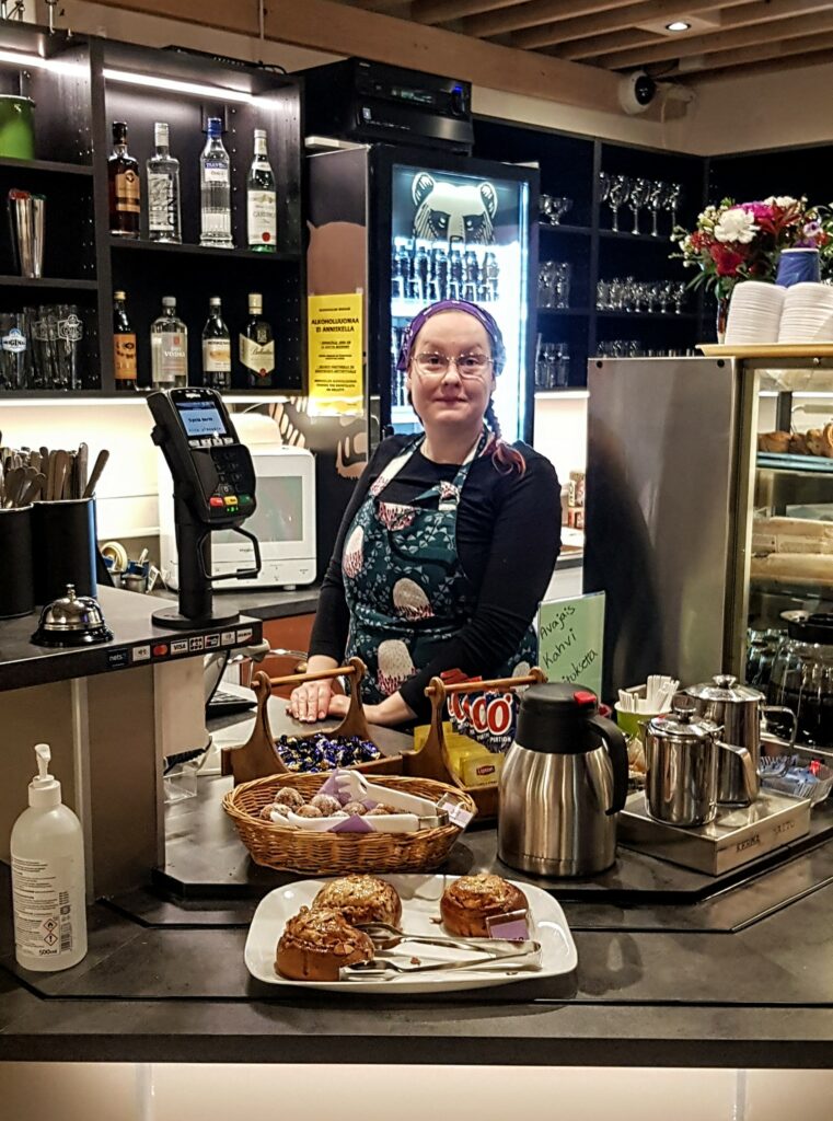 Sanna kertoo edelleen, että kahvilaa remontoitiin joulukuussa ja osa keittiön koneistakin uusittiin. Tuotevalikoimassa jatkamme Kulta Katriina kahvilla, joka on paikan vanhoille asiakkaille tuttu ja tietojemme mukaan ollut suosittu kahvimerkki, sekä tietysti tuoreilla leivonnaisilla. Näin alkuun vain munkit teen itse, toistaiseksi muut makeat leivonnaiset tilataan raakapakasteena. Tavoitteena on jossain vaiheessa tehdä nekin kaikki itse. Sämpylät tulevat toistaiseksi tukusta, mutta ne ”täytetään” täällä. Erikoiskahvikonetta saatamme harkita jossain vaiheessa, mutta ei vielä, pohtii Sanna.