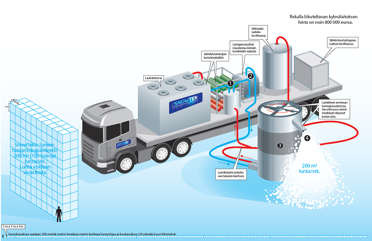 SnowTekin huipputekniikalla voidaan lunta tuottaa vaikka päiväntasaajalla. Lumentekoprosessissa on suljettu kierto. Putkistoissa kiertää vesi, josta tuotetaan lunta. Tuotanto on ekologinen, koska lumetukseen ei lisätä ylimääräisiä aineita. Prosessia ohjataan tietokoneella.