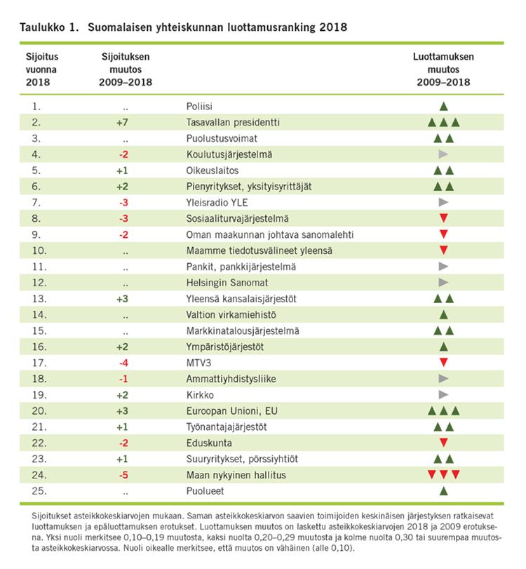 Elinkeinoelämän valtuuskunta EVA selvitti Arvo- ja asennetutkimuksessaan, kuinka suurta luottamusta suomalaiset tuntevat 28 erilaista yhteiskunnassamme vaikuttavaa tahoa kohtaan. Tiedot on kerätty syys-lokakuussa 2018. EVA teki vastaavan kyselyn vuonna 2009.