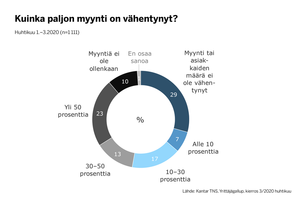 Yli puolet yrityksistä ilmoittaa, että myynti on vähentynyt 30 prosentilla tai enemmän. Lähes neljäsosalla (23%) myynti on vähentynyt alle puoleen normaalista. Joillakin yrityksillä myynti on kuitenkin jopa kasvanut (3% yrityksistä).