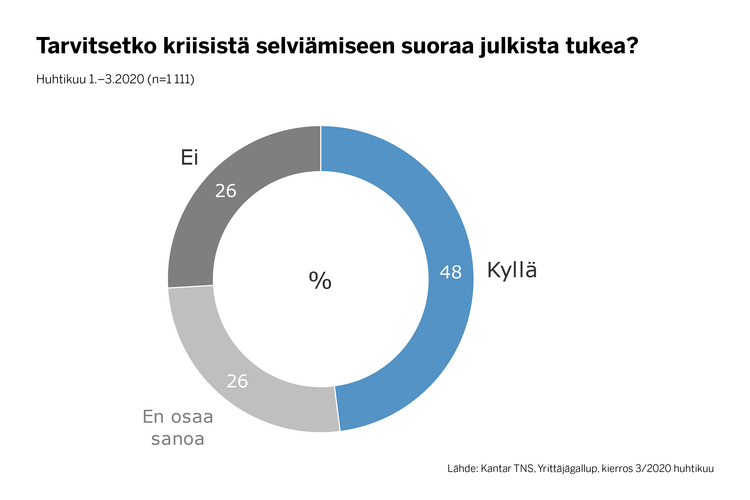 Lähes joka toinen yritys (48%) kokee tarvitsevansa ja aikoo myös hakea suoraa julkista tukea.