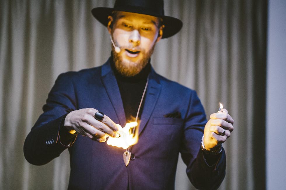 Pääohjelman avasi showalan moniottelija, taikuri ja juontaja Joni Pakanen, joka sai Yritystä Stadiin! -yleisön eloon vauhdikkaalla sisääntulollaan. Myöhemmin nähtiin vielä vaikuttavia silmänkääntötemppuja juontojen välissä, jotka saivat raikuvat aplodit.