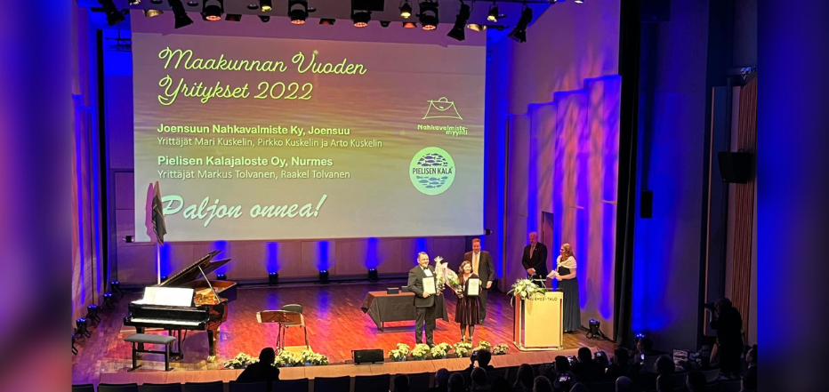 Pohjois-Karjalan Yrittäjät luovuttivat Maakunnan Vuoden 2022 Yrittäjäpalkinnot joensuulaiselle Joensuun Nahkavalmiste Ky:lle ja nurmeslaiselle Pielisen Kalajaloste Oy:lle lauantaina 3.12. Nurmeksessa pidetyssä Maakunnallisessa Yrittäjäjuhlassa. Palkinnon ottivat vastaan Joensuun Nahkavalmiste Ky:stä yrittäjä Mari Kuskelin sekä Pielisen Kalajaloste Oy:stä Juha Halonen.