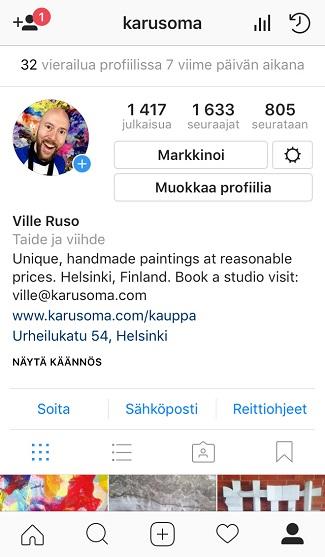 Instagram on kuvien jakoon erikoistunut some-palvelu. Se soveltuu erittäin luontevasti luovan työn tekijöille. Palvelu on erinomainen visuaalisten teosten esittelyyn, mutta aggressiivisena myyntikanavana ei ole paras vaihtoehto. Yrittäjän kannalta on tärkeää pitää huolta profiilin tiedoista, jotta potentiaaliset asiakkaat voivat lähestyä yritystä sähköpostin tai kotisivujen kautta.