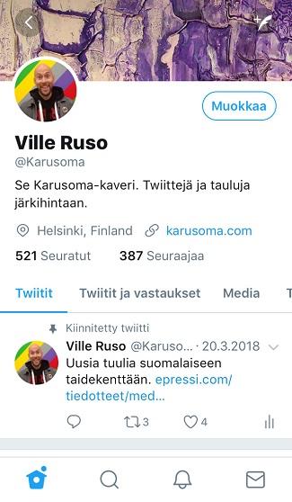 Jutussamme esimerkkiyrittäjänä oleva Ville Ruso on uniikkeja tauluja tekevän Karusoma-brändin luoja, joka on ollut aktiivisesti mukana sosiaalisessa mediassa yrittäjyyden alusta ja kasvattanut asiakaskuntaansa pääsääntöisesti sen kautta. Vinkkeinä Ruso sanoo, että kaikkiin palveluihin kannattaa heti rekisteröityä, vaikkei niihin sisältöä tekisikään. Näin välttyy kädenväännöiltä jälkikäteen, jos joku muu nappaa brändin nimen ennen sinua.