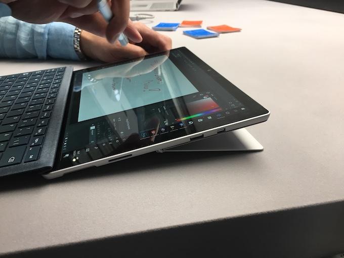 Pron näyttö on 12,3-tuumainen eli aavistuksen pienempi kuin isommassa iPad Pro -versiossa. Näytön reunassa on magneettipidike kosketuskynälle, jonka tarkkuutta on parannettu. Kynään on lisätty tuki kallistukselle, minkä ansiosta se soveltuu paremmin taiteelliseen piirtämiseen. Surface-kynä toimii myös Microsoft Office -sovellusten kanssa. Surface Pron ostaja joutuu odottamaan uuden Surface-kynän tuloa, sillä sen myynti alkaa lähiviikkoina.
