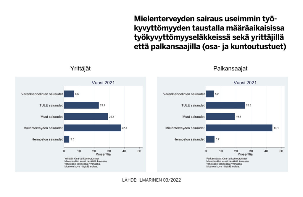Työeläkevakuutusyhtiö Ilmarisen tilastojen mukaan vuonna 2021 määräaikaisissa työkyvyttömyyseläkkeissä oli mielenterveyden sairaus taustalla yrittäjien osalta noin 38 prosentilla. Palkansaajilla lukema on 44,1 prosenttia.