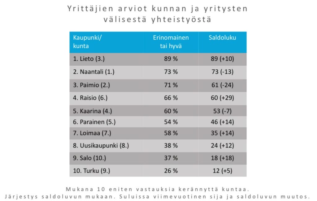 Lieto pitää kärkipaikkaa myös, kun yrittäjät arvioivat kunnan ja yritysten välistä yhteistyötä. Liedossa ei yksikään vastaaja ole arvioinut kunnan ja yritysten välistä yhteistyötä huonoksi. Kärkikolmikossa ovat tänä vuonna myös viime vuonna parhaaksi arvioitu Naantali saldoluvulla 73 (-13 yksikköä viime vuodesta) sekä merkittävän parannuksen kunnan ja yritysten välisessä yhteistyössä tehnyt Raisio saldoluvulla 60 (+29 yksikköä). Raisiossa kunnan ja yritysten väliset yhteistyöarviot olivat nousussa jo viime vuonna. Kaarinassa kunnan ja yritysten välistä yhteistyötä mittaava saldoluku on pudonnut ja se on 53 (-7 yksikköä). Turku on parantanut niin ikään kunnan ja yritysten välisessä yhteistyöarviossa, mutta on siitä huolimatta saanut Turun alueen heikoimman arvion, kun saldoluku on 12 (+5 yksikköä).