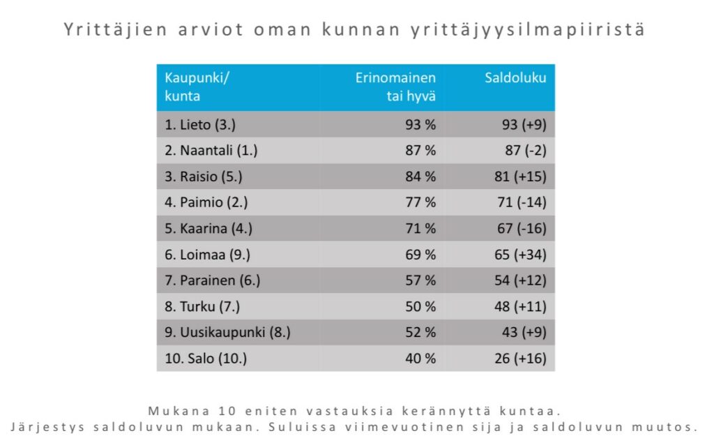 Paras seutukunta sekä yrittäjyysilmapiiriltään että kunnan ja yritysten välisessä yhteistyöarviossa on Loimaan seutu. Parhaaksi kunnaksi sekä yrittäjyysilmapiiriltään että kunnan ja yritysten välisen yhteistyön osalta on arvioitu Lieto.