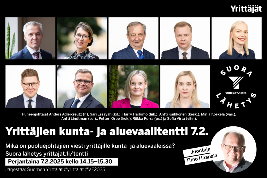 Mikä on puoluejohtajien viesti yrittäjille kunta- ja aluevaaleissa? Tämä selvisi perjantaina iltapäivällä, kun eduskuntapuolueiden puheenjohtajat Anders Adlercreutz (r.), Sari Essayah (kd.), Harry Harkimo (liik.), Antti Kaikkonen (kesk.), Minja Koskela (vas.), Antti Lindtman (sd.), Petteri Orpo (kok.), Riikka Purra (ps.) ja Sofia Virta (vihr.) kohtasivat Suomen Yrittäjien kunta- ja aluevaalitentissä.