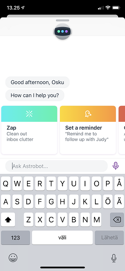 ekoälyn ohjaamaa, chat-käyttöliittymällä ohjattavaa astrobotia voi käyttää luomaan esimerkiksi kalenterimerkintöjä, siivoamaan postikansioita ja muistutuksia viesteistä, joihin tulee vastata. Astrobot osaa opastaa kattavasti käyttäjää sen sisältämien toimintojen osalta, joten ominaisuudet oppii harjoittelemalla nopeasti.