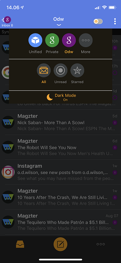 Erikoisuutena TypeApp tukee tummaa Dark Mode -tilaa, jossa valkoinen teksti on tumman harmaalla taustalla. Tummassa tilassa postien lukeminen illallakaan ei rasita silmiä. Sovelluksen voi asettaa älä häiritse -tilaan, jolloin sähköpostii-lmoitukset eivät kilahtele ruudulle epätoivottuna aikana.