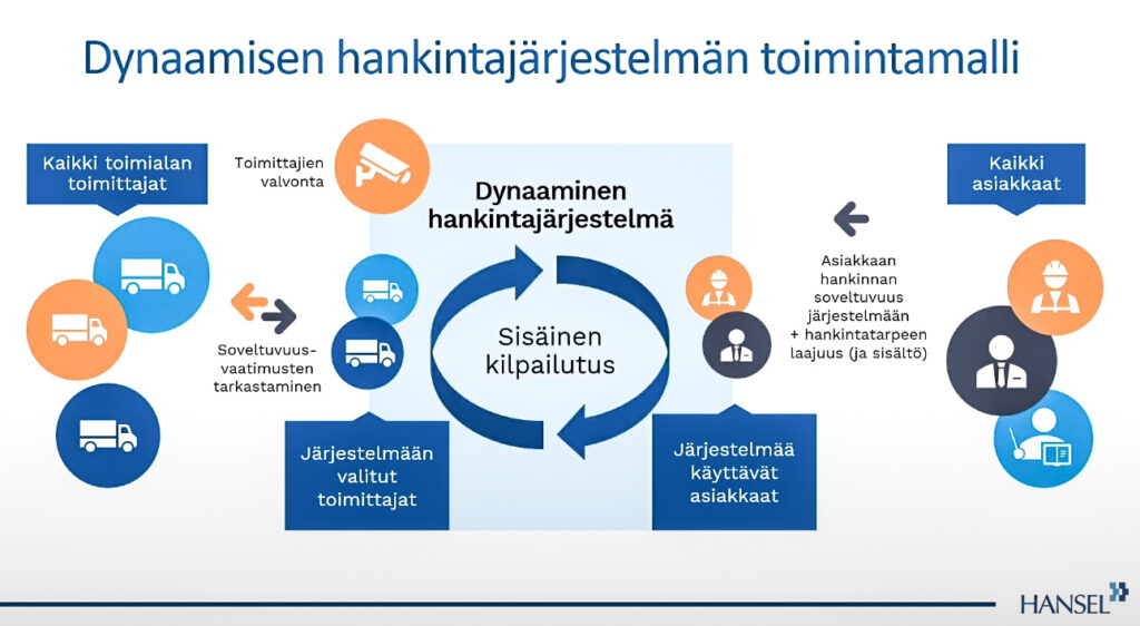 Hansel Oy on valtion ja kuntien yhteishankintayksikkö, minkä omistavat valtio ja Suomen Kuntaliitto. Hansel välitti yhteishankintoja yli miljardilla eurolla vuonna 2021. Yhteishankinnoista noin kolmasosa on dynaamisella hankintajärjestelmällä toteutettuja. Hansel kilpailuttaa ja hyväksyy toimittajat sekä hallinnoi sopimuksia. Asiakas liittyy ja tekee sekä kilpailuttaa hankintoja yhteishankinnan toimintamallin mukaisesti.