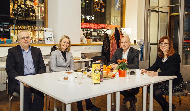 Kuvassa: Työtä yrittäjyyden eteen! Helsingin Yrittäjien puheenjohtaja Sarianne Reinikkala ja toimitusjohtaja Tiina Oksala tapasivat joulukuussa Uudenmaan uudet muutosjohtajat Timo Aronkytön ja Markus Sovalan sote- ja maakuntauudistuksen tiimoilta.