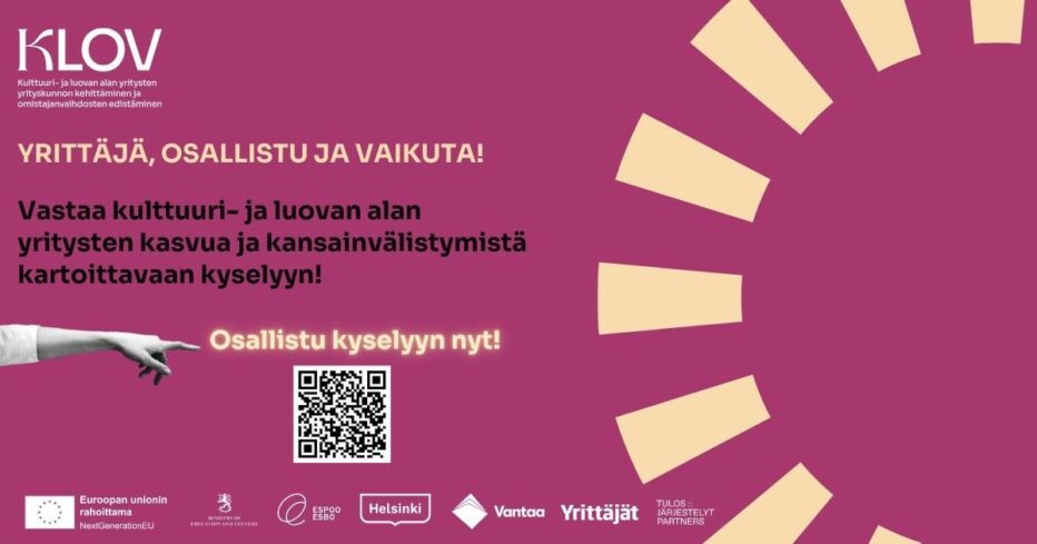 Suomen Yrittäjien KLOV-hanke selvittää kyselyllä kulttuuri- ja luovan alan yritysten valmiutta ja näkymiä kasvuun ja kansainvälistymiseen. KLOV-hankkeen tavoitteena on kehittää kulttuuri- ja luovan alan yritysten yrityskuntoa ja valmiutta omistajanvaihdoksiin. Hanke on Euroopan unionin rahoittama.