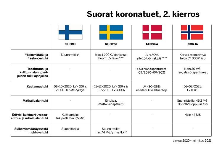 Selite: Suomi: * Toinen kierros tulossa, ajankohdasta ei tietoa; kustannustuki 11/2020-1/2021 suunnitteilla. Ruotsi. ** Kauden LV alle 70% v.2019 vertailujaksosta; Yksinyrittäjätuki: *** LV