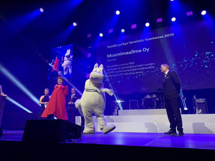 Muumimaailma Oy palkittiin lauantaina maakunnallisella yrittäjäpalkinnolla Varsinais-Suomen Yrittäjägaalassa Logomossa.