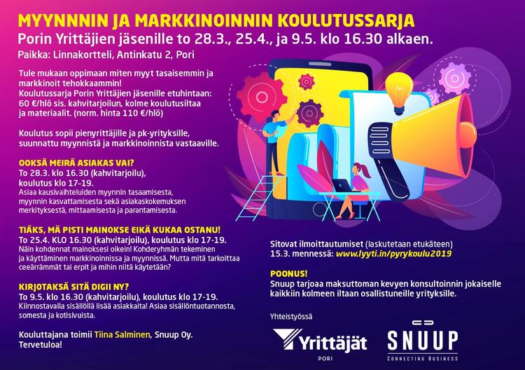 MYYNNNIN JA MARKKINOINNIN KOULUTUSSARJA PORIN YRITTÄJIEN JÄSENILLE Torstaisin 28.3., 25.4., ja 9.5. klo 16.30 alkaen.