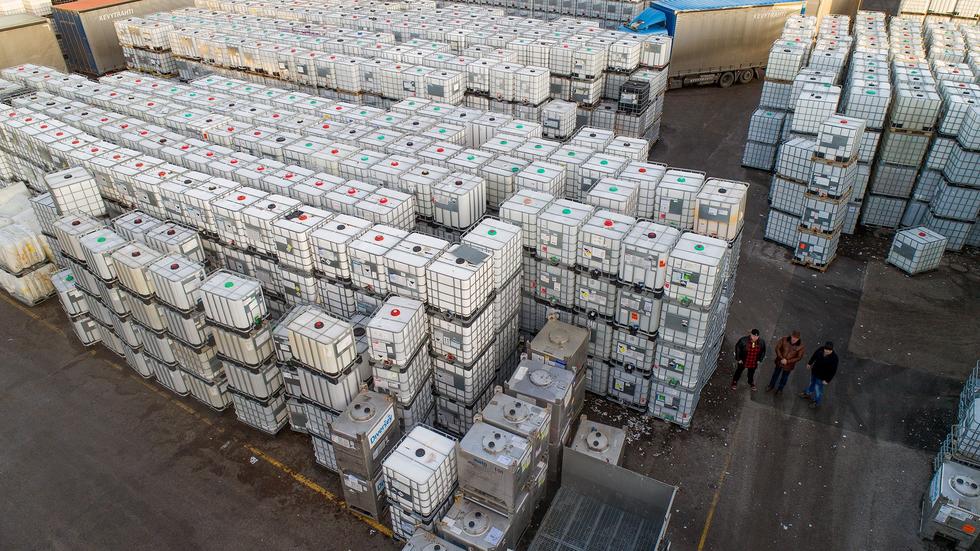 Tuotantolaitoksen pihalla Kellokoskella on tuhansia IBC-kontteja