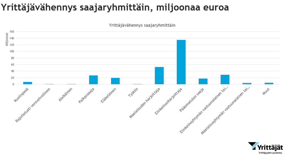 – Kun katsotaan euroja, niin elinkeinonharjoittajat saivat noin 140 miljoonaa euroa yrittäjävähennystä ja maatalouden harjoittajat hiukan yli 50 miljoonaa. Palkansaajien ja eläkeläisten saamat vähennykset olivat vain noin 20 miljoonan euron luokkaa. Eläkeläisten ja palkansaajien saamat vähennykset ovat siis varsin pieniä, Mika Kuismanen toteaa.