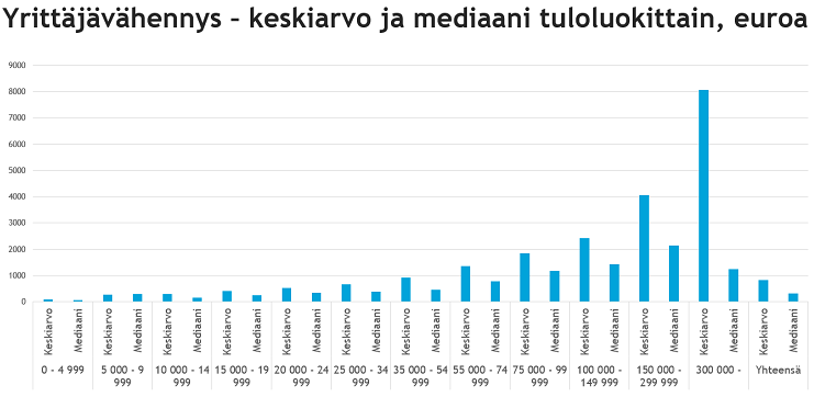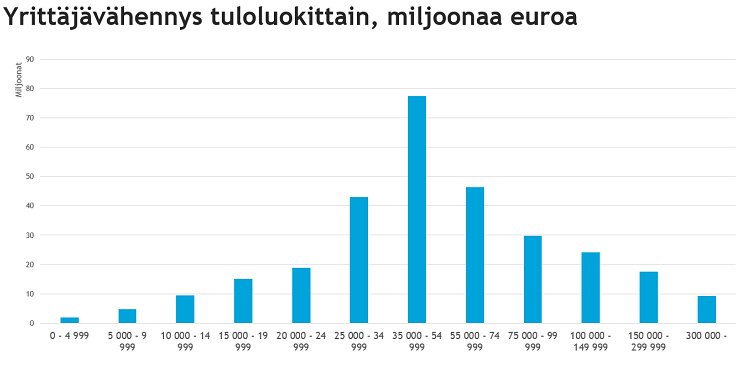 Yrittäjävähennyksen saajia oli 344 000 ja sitä jaettiin 297 miljoonaa euroa vuonna 2017. Vähennystä saivat hyvin monella eri tulotasolla olevat henkilöt.