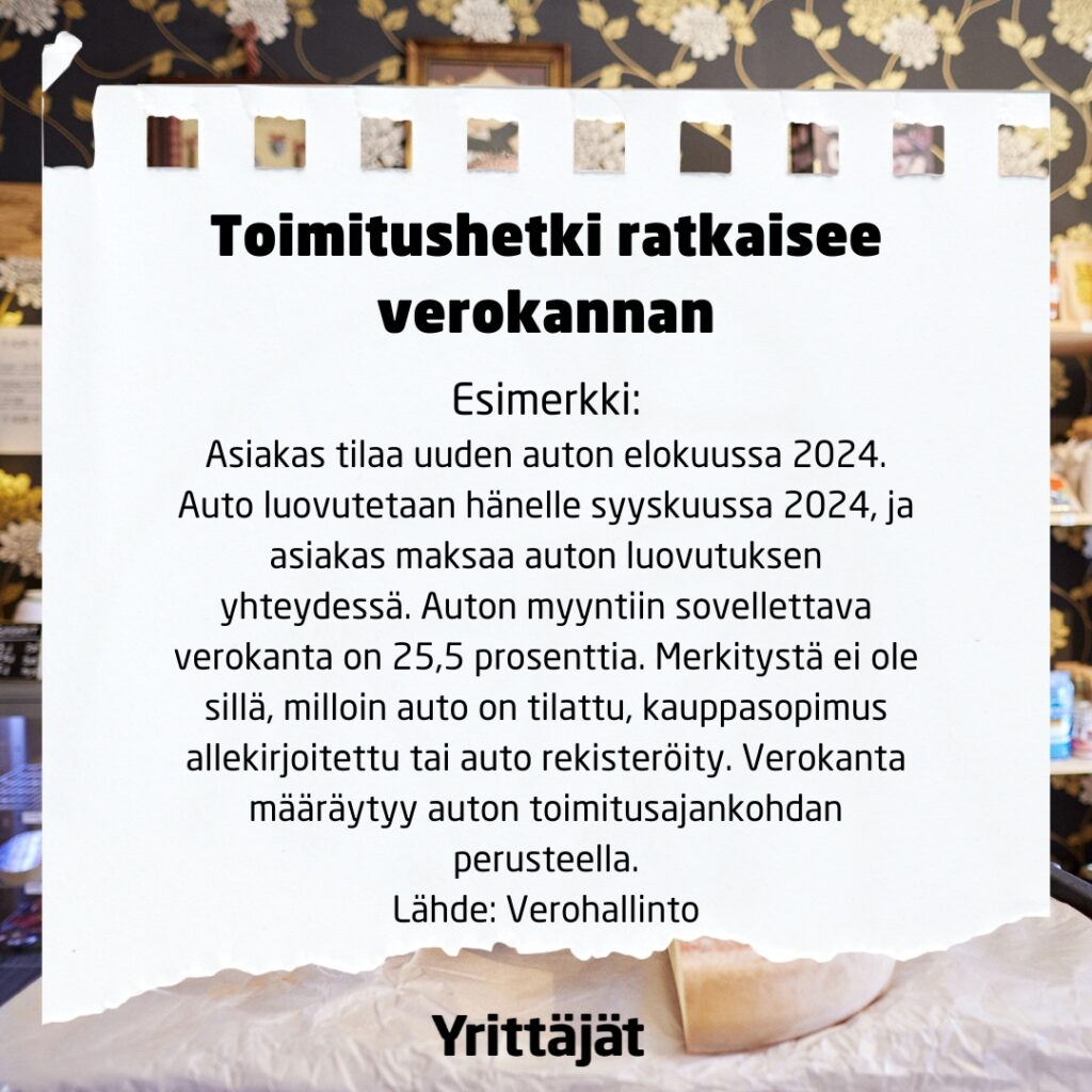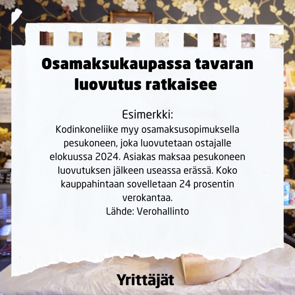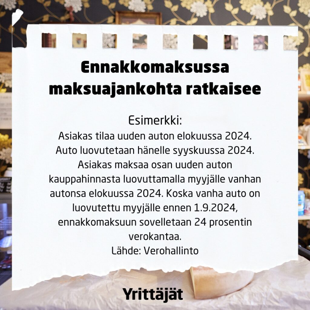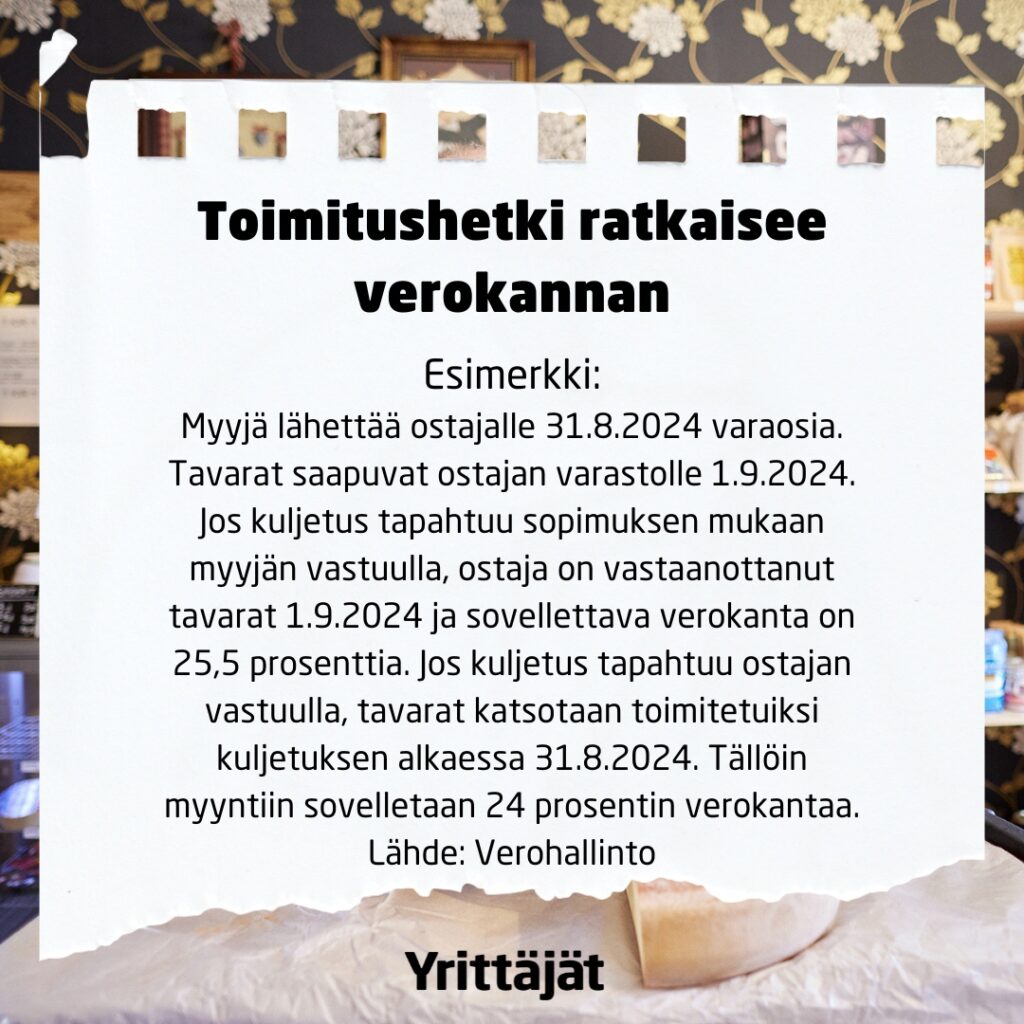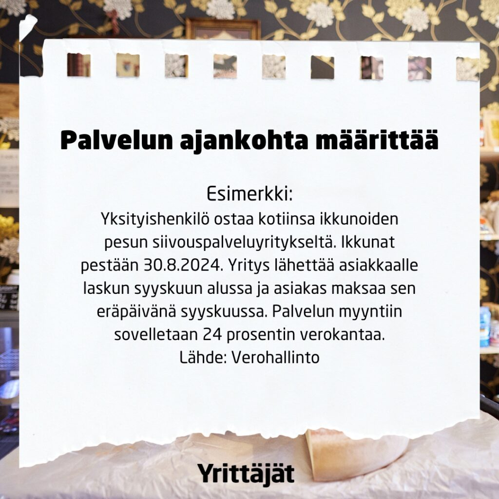25.6.2024 klo 08:34 Uutinen Näin verottaja ohjeistaa ALV-muutoksesta Tämä teksti on konekäännetty. Yrittäjät on laatinut esimerkkejä tulevaan ALV-muutokseen liittyen. Kuvat on laadittu Verohallinnon esimerkkien pohjalta. Jaa Kopioitu leikepöydälle
