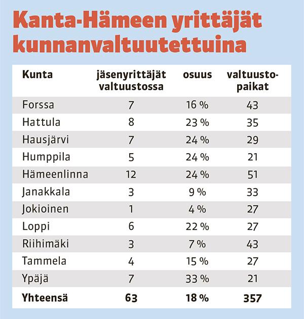 Edellisissä kuntavaaleissa neljä vuotta sitten Hämeen 357 valtuustopaikkaa tavoitteli yhteensä 241 yrittäjää. Äänestäjien mandaatin lunasti kaikkiaan 63 paikallisten yrittäjäyhdistyksien jäsenyrittäjää. Heidän lisäkseen valtuustoihin nousi 13 muutakin yrittäjää.