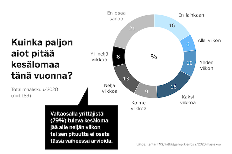 Yrittäjägallupin mukaan yrittäjät pitävät lomapäiviä vähän. Yli neljä viikkoa lomaa pitää vuoden aikana vain 20 prosenttia yrittäjistä . Kolme viikkoa vuodessa lomailee 15 prosenttia ja kaksi viikkoa 17 prosenttia yrittäjistä. Kahdeksan prosenttia ei pidä lomaa lainkaan. Vähiten lomailevat ne yrittäjät, joilla on 2–4 työntekijää.