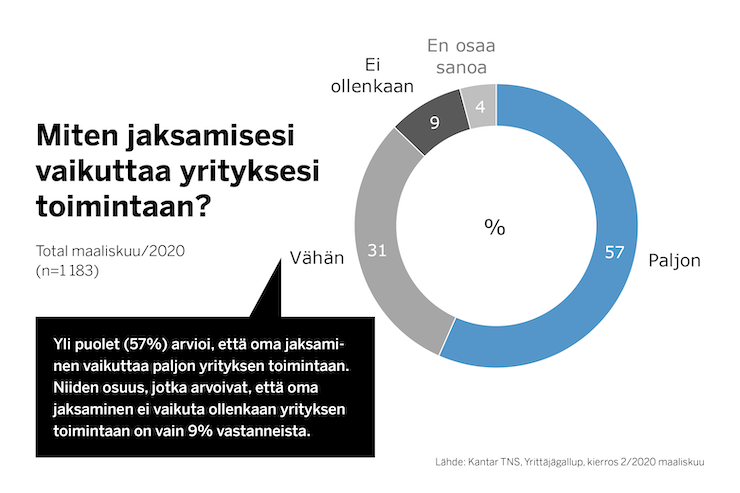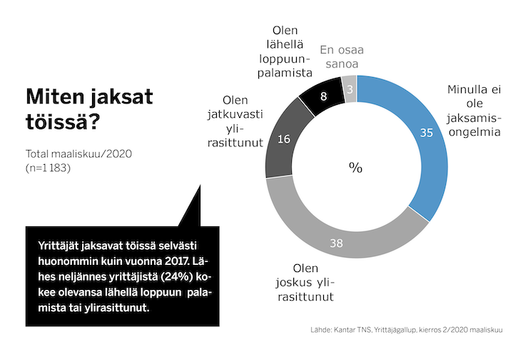 Tuoreen Yrittäjägallupin mukaan 24 prosenttia yrittäjistä on jatkuvasti ylirasittunut tai lähellä loppuun palamista. Tutkimus toteutettiin 18.–24. maaliskuuta, jolloin koronakriisi oli jo iskenyt yrityksiin täydellä voimallaan.