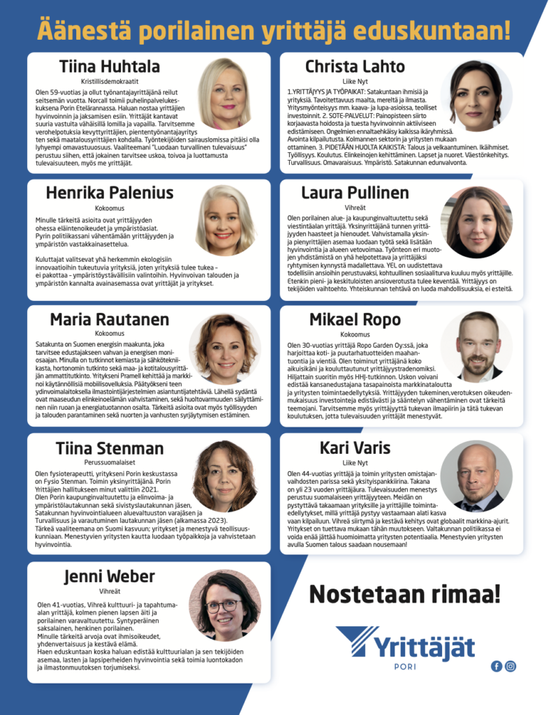 Porissa on ehdolla jopa yhdeksän loistavaa yrittäjien jäsenehdokasta! Heidän joukosta voit valita mieleisesi ja antaa äänesi yrittäjyysmyönteiselle tulevaisuudelle. Jokaisen ääntä tarvitaan, joten napataan mukaan naapurit, ystävät ja kylän tutut ja suunnataan yhteistuumin uurnille – nostamaan rimaa.