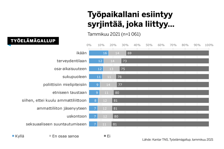 Työpaikoilla esiintyy työllisten arvioiden mukaan eniten (16 %) ikään liittyvää syrjintää. Seuraavaksi eniten on havaittu terveydentilaan (12 %) ja osa-aikaisuuteen (12 %) sekä sukupuoleen (11 %) liittyvää syrjintää. Vähiten on tunnistettu seksuaaliseen suuntautumiseen, uskontoon tai ammattiliiton jäsenyyteen kytkeytyvää syrjintää (kaikkia 7 %).