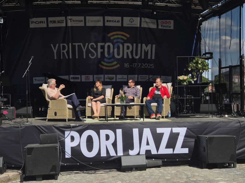 Peter Vesterbacka, Kari Varis ja Katja Hautamäki pohtivat yrittäjyyttä ja koulutuksen roolia uutisankkuri Keijo Leppäsen haastattelemana Yritysfoorumissa Porissa heinäkuussa.