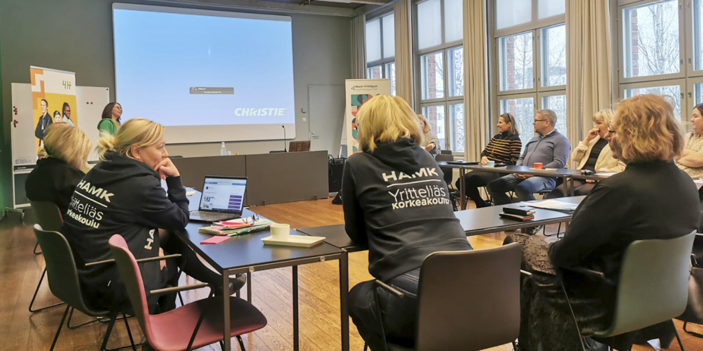 Ypäjän Hevosopistossa yrittäjyyskasvatuksen tilanne ja kehitysohjelman esittely. Mukana opinto-ohjaaja Maria Kallio.