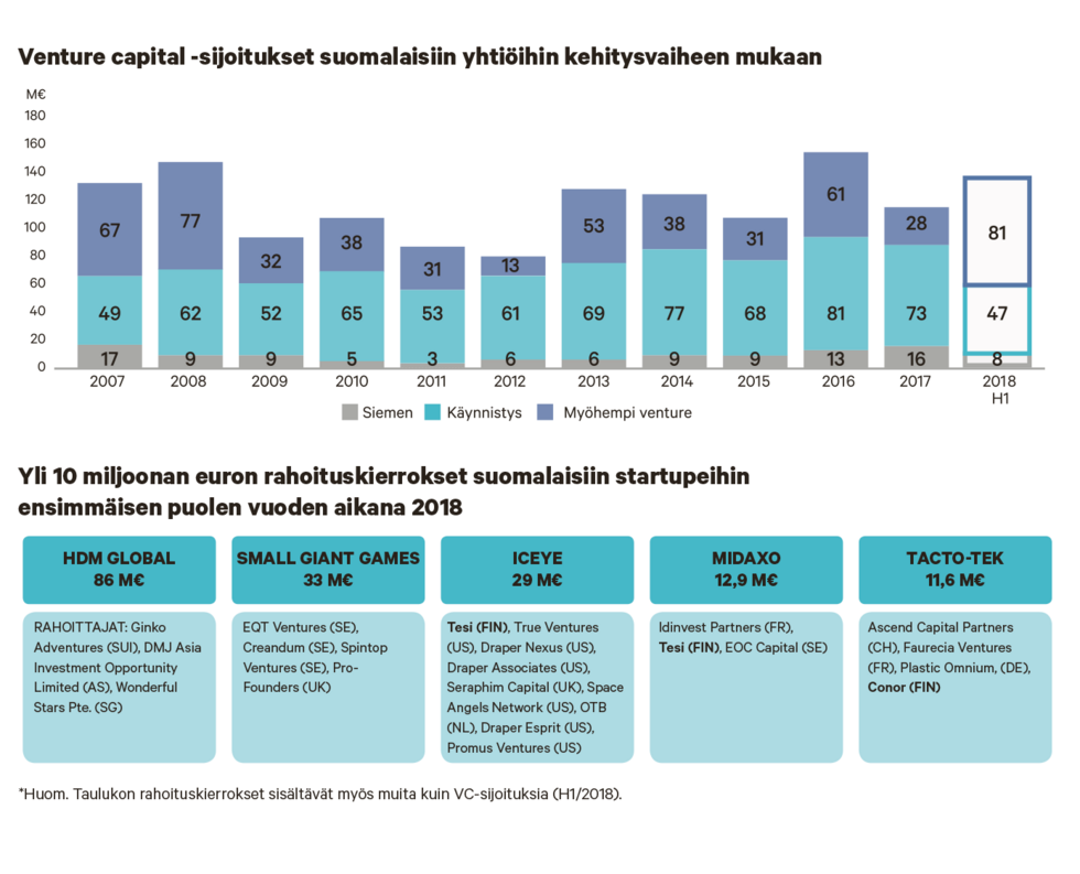 Vuonna 2018 yli 10 miljoonan euron rahoituskierrokset suomalaisiin startupeihin ovat keränneet Nokia-puhelimia valmistava HDM Global, joka keräsi 86 miljoonan euron kierroksen, pelinkehittäjä Small Giant Games 33 miljoonan, avaruustekniikka-alalla toimiva ICEYE 29 miljoonan, yrityskauppaohjelmistoa kehittävä Midasxo 12,9 miljoonan ja rakenteellista elektroniikkaa kehittävä Tacto-Tek 11,6 miljoonan euron kierroksillaan.