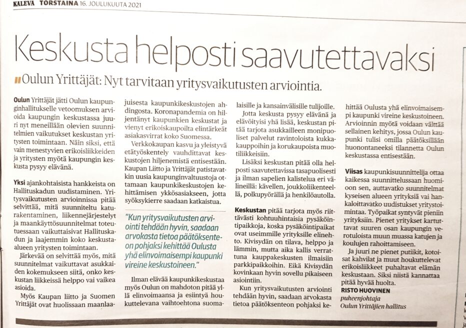 Oulun Yrittäjät jätti Oulun kaupunginhallitukselle vetoomuksen arvioida kaupungin keskustassa juuri nyt meneillään olevien suunnitelmien vaikutukset keskustan yritysten toimintaan. Näin siksi, että vain menestyvien erikoisliikkeiden ja yritysten myötä kaupungin keskusta pysyy elävänä.