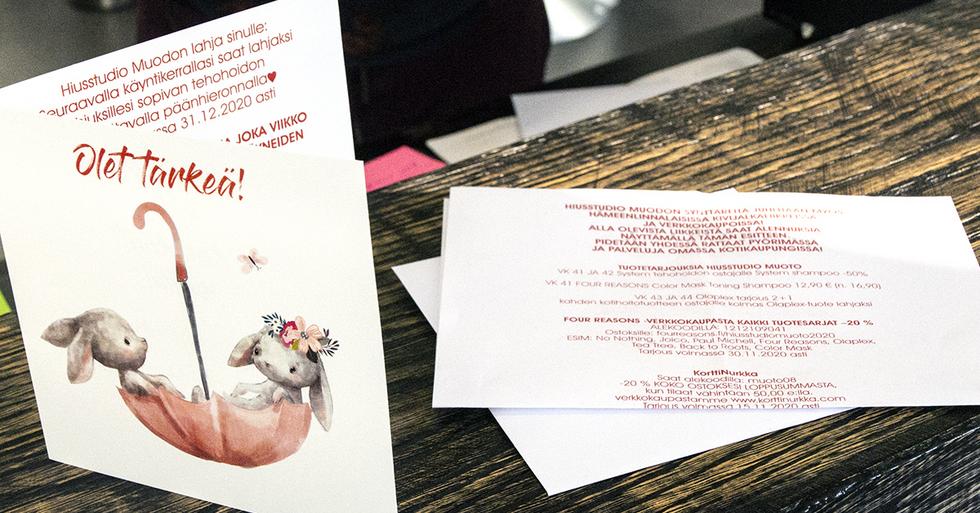 – Ostin eri liikkeistä 5–20 € arvoisia lahjakortteja. Kysyin yrittäjiltä, haluaisivatko antaa pienen tarjouksen esitteeseen minkä jaamme kaikille asiakkaillemme synttärikortin välissä? Kaikki yrittäjät olivat heti mukana, mikä oli ihan mieletöntä, iloitsee Minna.