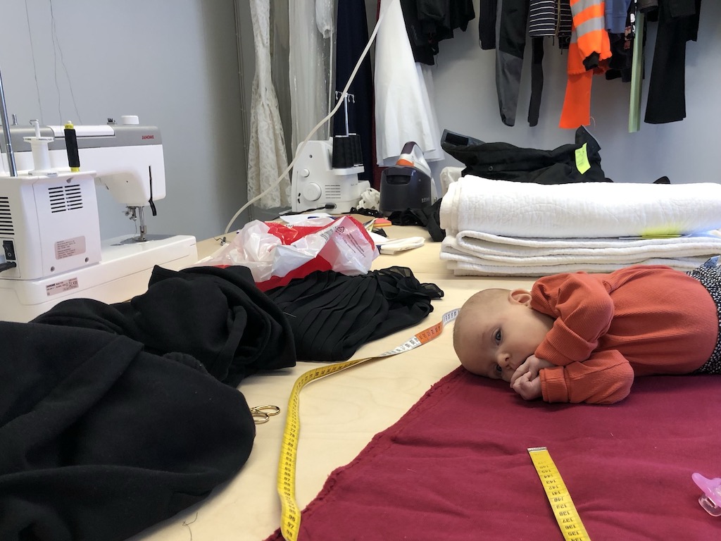 Keskimmäinen istui sitterissä ja nukkui Vuorisalon työpöydällä omassa korissaan. Lapset ovat edelleen toisinaan Vuorisalon mukana töissä ompelimossa.
