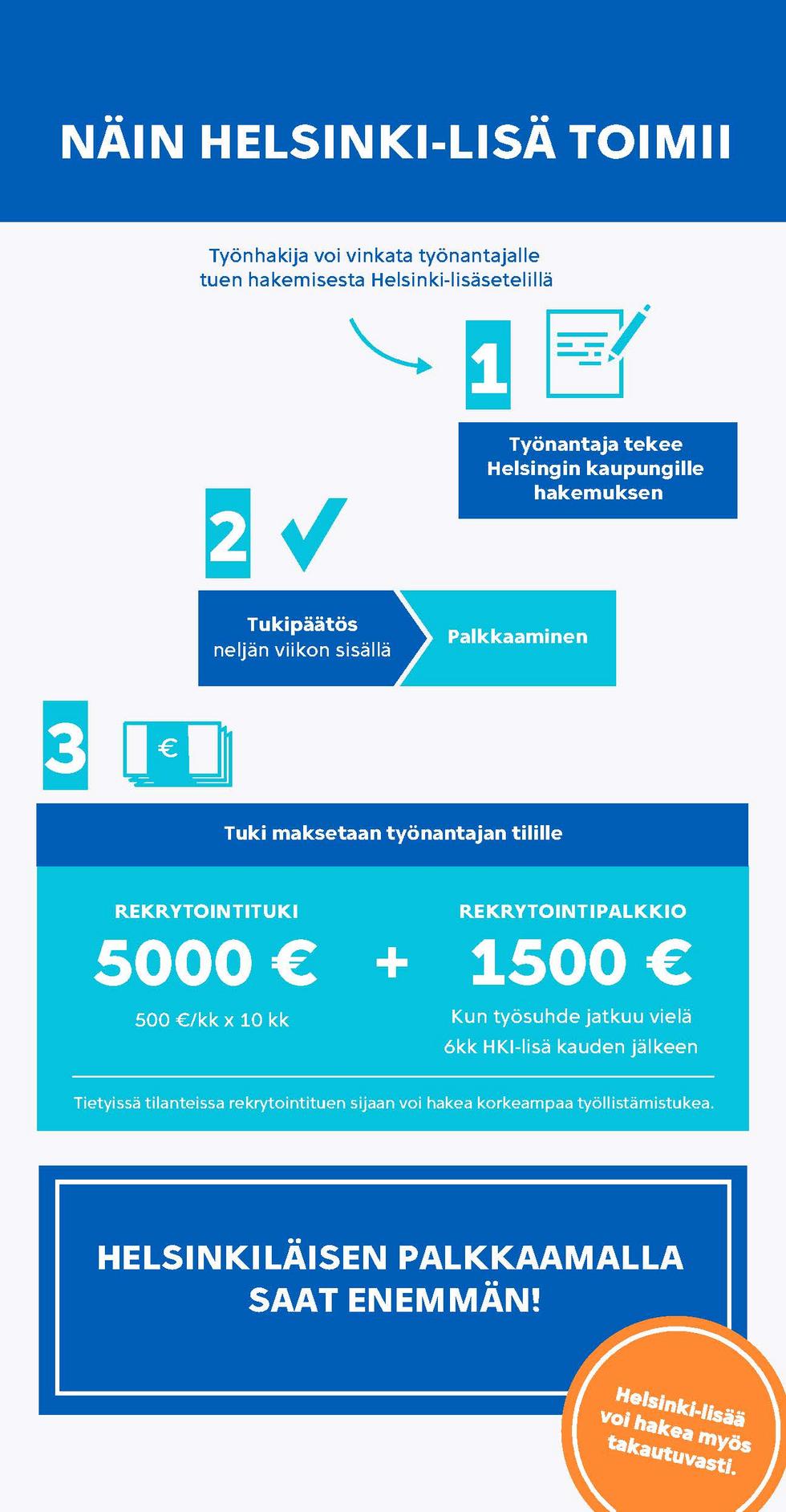 Työnantajat voivat hakea Helsingin kaupungin elinkeino-osaston myöntämää Helsinki-lisää, jota voidaan myöntää 0-800 euroa kuukaudessa jopa kymmenen kuukauden ajaksi. Tuki on aina harkinnanvarainen. Helsinki-lisää myönnetään kahtena eri muotona, eli Rekrytointitukena (kiinteä 500 euroa kuukaudessa) ja Työllistämistukena (0–800 euroa kuukaudessa). Varsinaisen Helsinki-lisä-tukikauden jälkeen on haettavissa lisäbonuksena kertaluontoinen rekrytointipalkkio (1500 euroa).