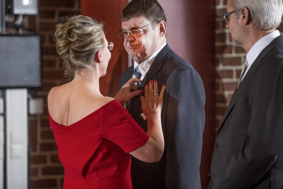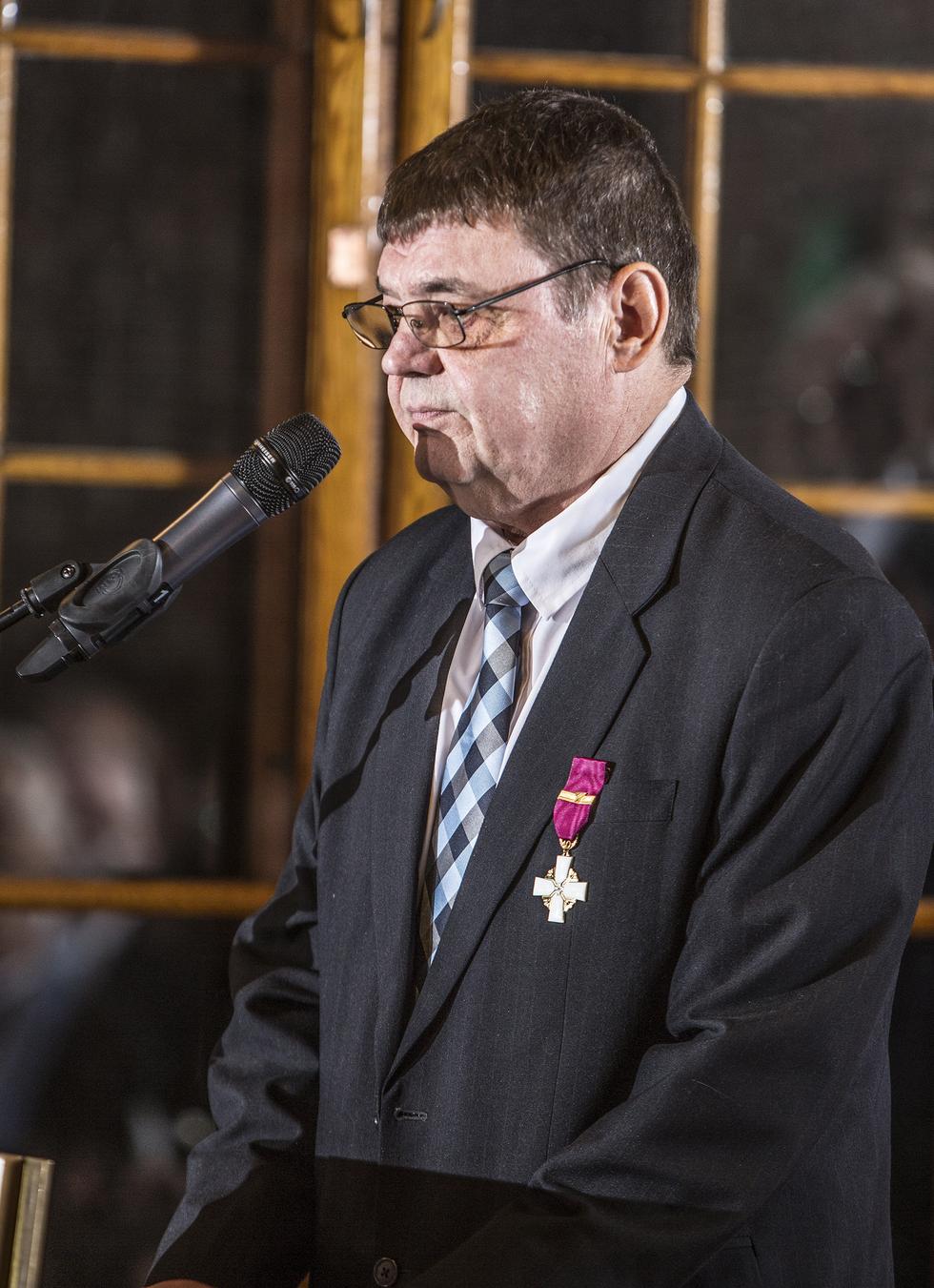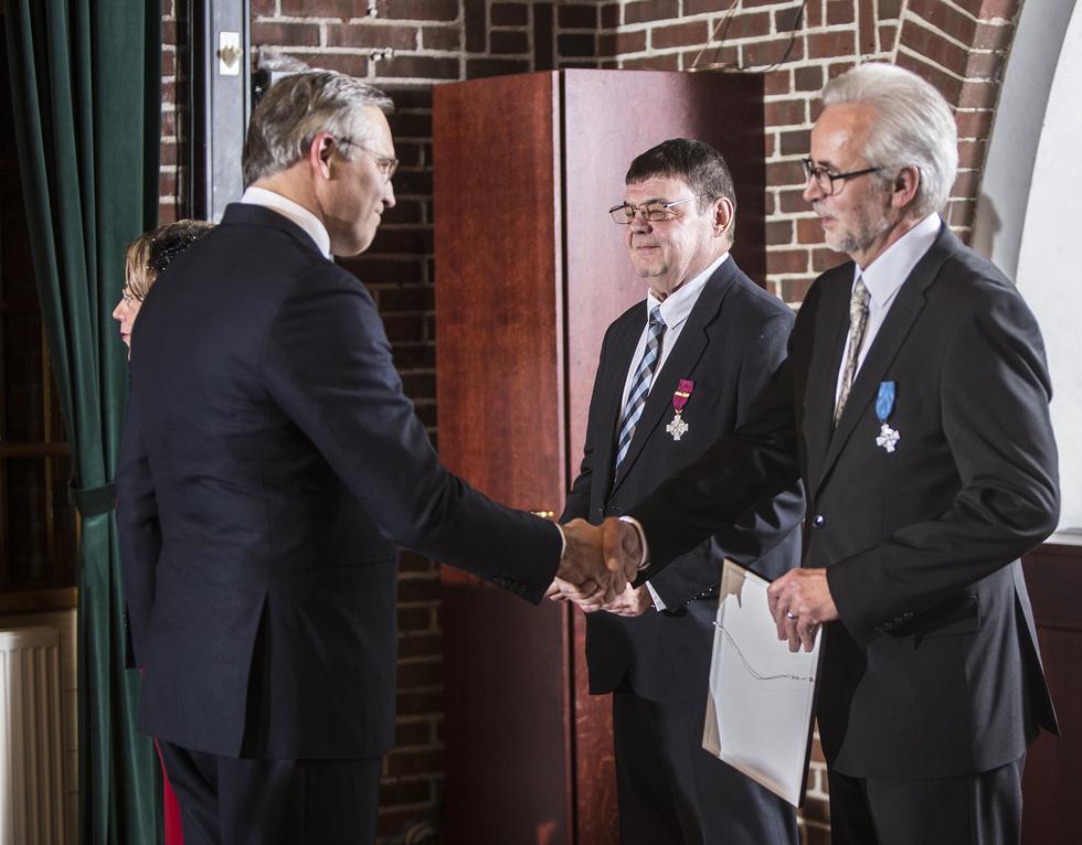 40 v. timattinen yrittäjäristi luovutettiin yrittäjä Seppo Elomaalle LVI-asennus S Elomaa Ky:stä ja hopeinen ansioristi Pekka Katajalle Tuotantoyhtiö Hihhihhii Oy:stä.